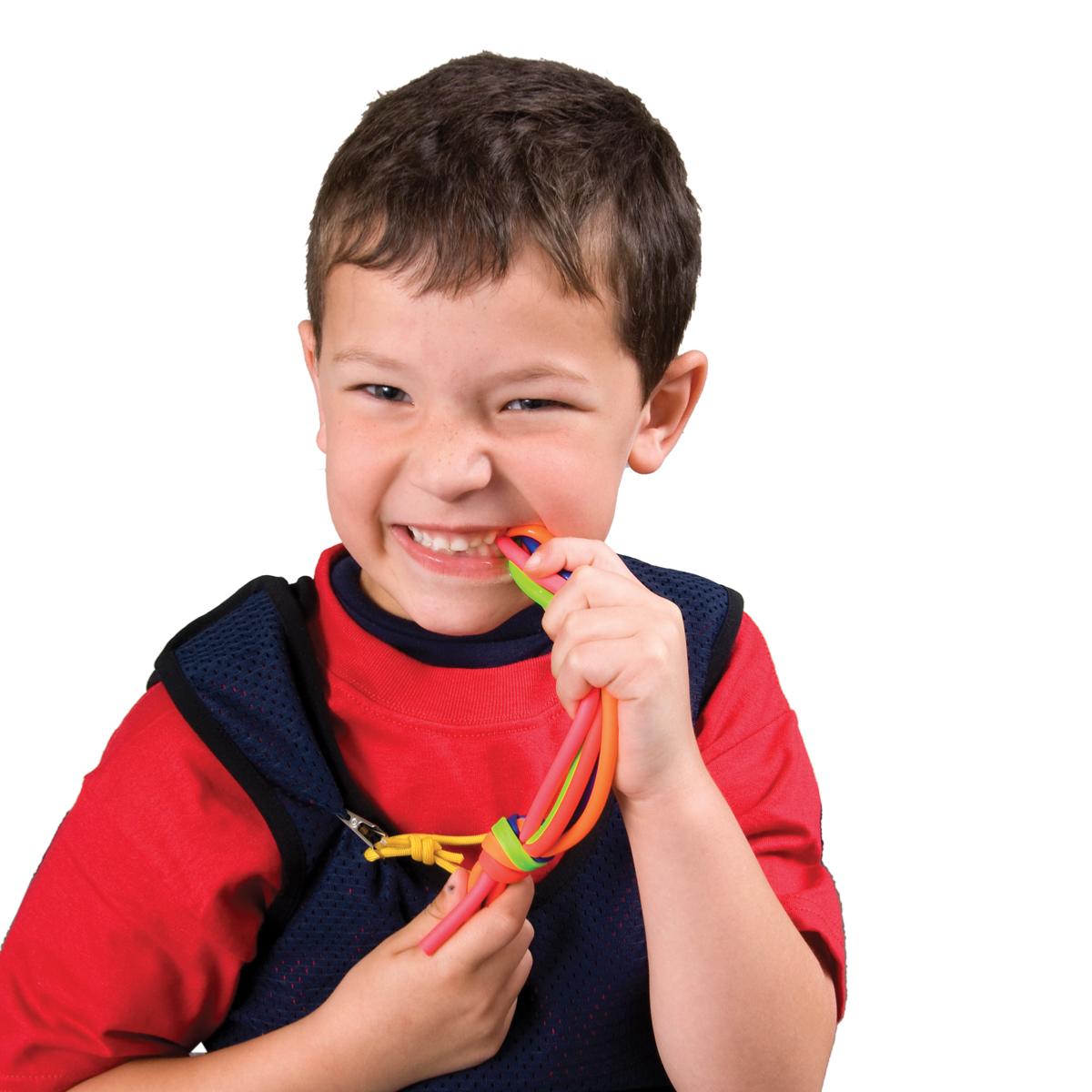 Basée sur la théorie de l’Intégration Sensorielle (Kane, Luiselli, Dearborn & Young, 2004), la pression exercée par les molaires arrière sur un outil à mâcher procure à la personne une pression profonde (proprioception). Cette technique peut aider une personne avec autisme ou TND à intégrer des données sensorielles.
