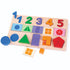 Ce puzzle éducatif est composé d'une planche en bois et de pièces en bois colorées, comprenant des chiffres et des formes.