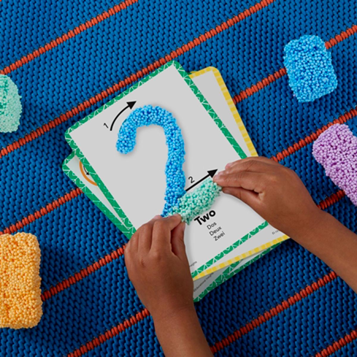 Activité d'apprentissage des chiffres et des formes en s'entraînant à l'aide des fiches support (13) et des 8 briques de pâte sensitive Playfoam® colorée.