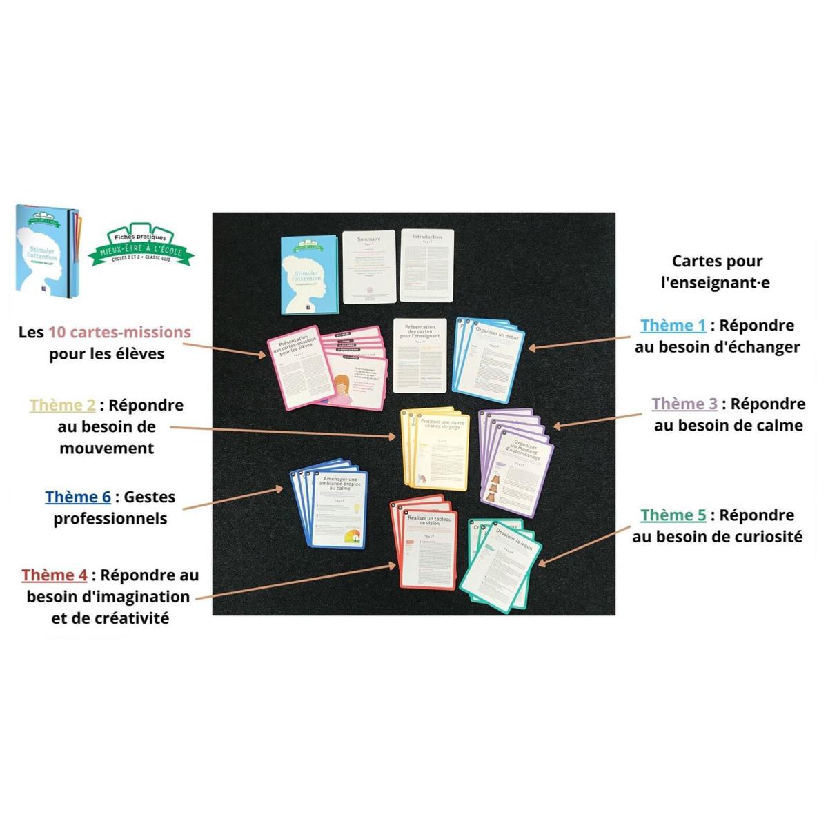 Les fiches sont réparties en 5 catégories, selon les besoins des élèves lorsqu’ils ont du mal à maintenir leur attention : besoin de calme, d’échange, de curiosité, de créativité et de mouvement.